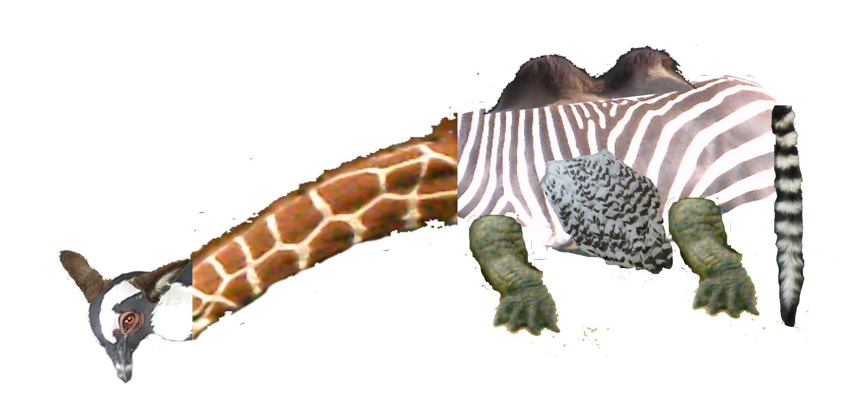 De oren zijn van één dier. Het oog is van een ander dier dan de kop.
